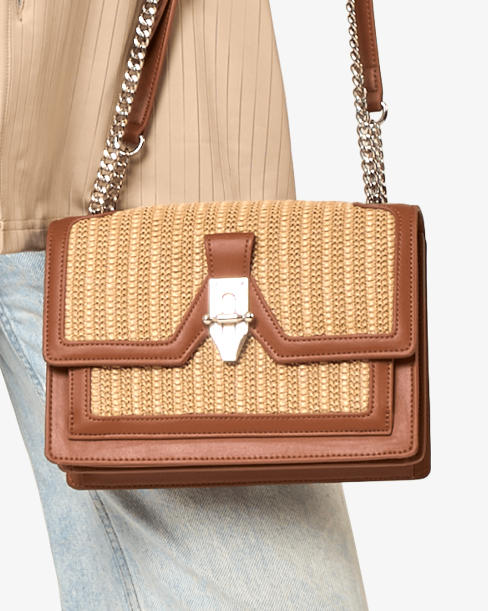 Sac porté épaule à rabat bimatière en synthétique effet cuir lisse et paille