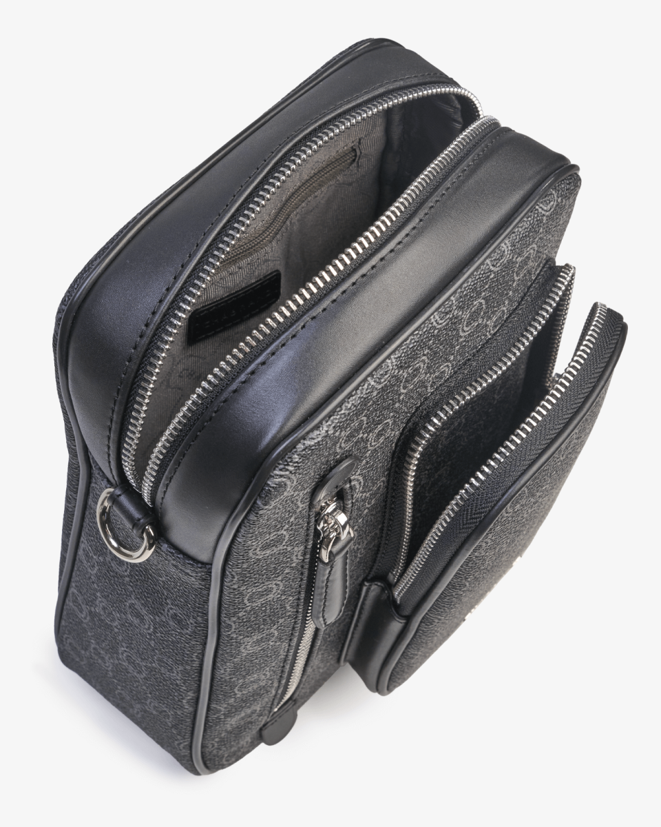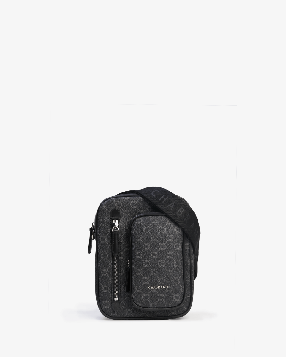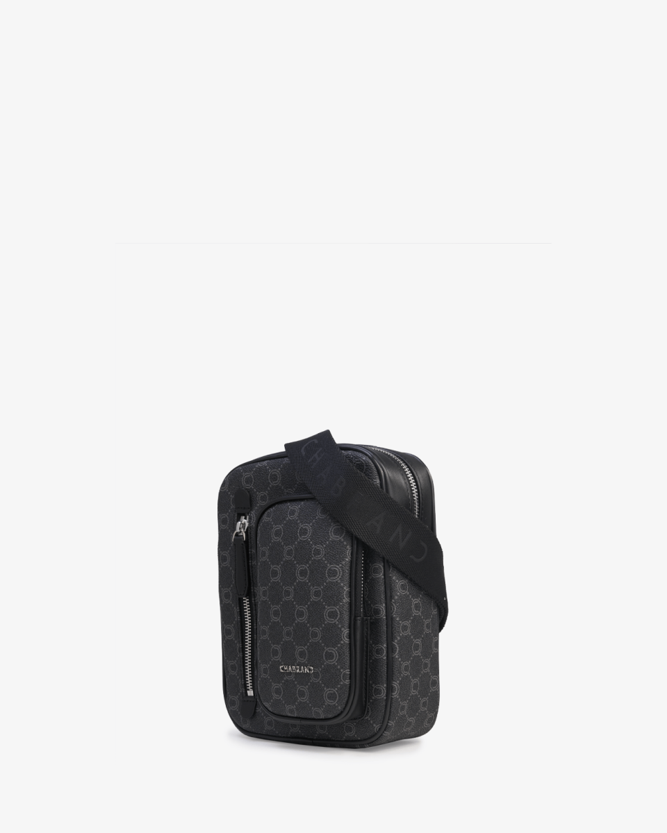 Sacoche noire en toile enduite siglée garnie cuir